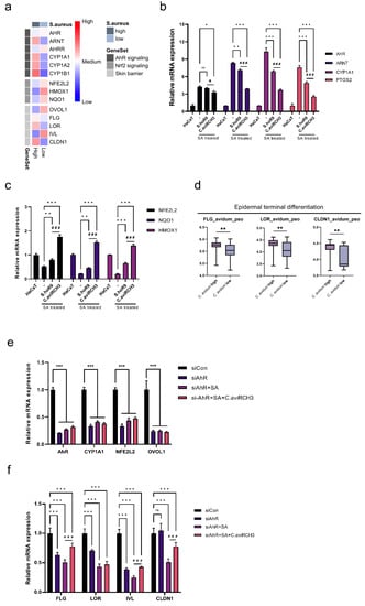 Dysbiosis of the skin microbiota can adversely affect skin homeostasis, and the predominant species SA in AD and Pso correlates with gene expression associated with the diseases []. Moreover, it is widely recognized that both AD and Pso are inflammatory skin diseases, and while different pathways are involved in the progression of AD and Pso, most of the dysregulated genes in the two diseases are shared []. Hence, we present the findings of this study, which examines the mechanisms underlying the skin barrier function regulated by AhR and the therapeutic potential of SA-derived inflammatory recovery.