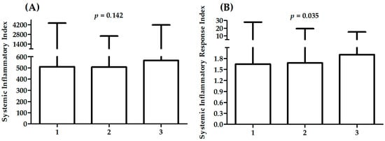 Differences in SII (A) and SIRI (B) between patients with different diagnosis.