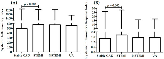 This study evaluated the relationship of two novel systemic inflammatory biomarkers, SII and SIRI, with the severity of CAD and the diagnosis of stable CAD versus ACS as part of a research project aimed at assessing the relationship of blood cell count as an inflammatory marker with CAD and its complications. We found that SII and SIRI were higher in patients diagnosed with STEMI, NSTEMI and UA compared to those with stable CAD; significantly higher values of these biomarkers were observed for patients with STEMI than those with stable CAD. Notably, the highest values of SII and SIRI were observed for patients with the highest stage of CAD, i.e., in patients with CASSC 3 in comparison to those with CASSC 0–2. In our previous study, we described significantly higher NLR values in patients undergoing coronary angiography due to subsequent ACS with a history of previous ACS compared to patients with stable CAD [44], as well as a lack of significant differences in platelet activity parameters (MPV and P-LCR) between these two groups [45]. In addition, the group of patients with three-vessel CAD had the highest NLR, but without statistical significance [44].
