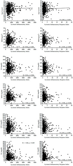 Figure 6 presents the correlation between the SII and SIRI biomarkers and age, BMI, and lipid profile. There was a significant correlation between age and both biomarkers.