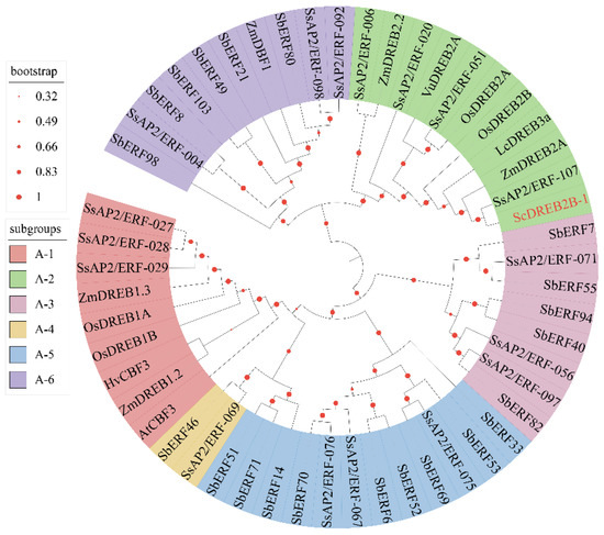 The physical and chemical properties of the protein encoded by the ScDREB2B-1 gene were analyzed using online ProParam software Expasy (https://web.expasy.org/protparam/) (The SIB Swiss Institute of bioinformatics, Switzerland, accessed on 1 August 2017). A total of 51 DREB proteins (A1 to A6 subgroup members of DREB subfamily) from A. thaliana, O. sativa, Z. mays, S. bicolor, S. spontaneum, L. chinensis, V. unguiculata and Hordeum vulgare were retrieved from the NCBI Entrez database (http://www.ncbi.nlm.nih.gov) (accessed on 4 August 2021), UniProt (https://www.uniprot.org/) (accessed on 4 August 2021) and maize genome sequence database (version 5b.60, http://www.maizegdb.org/) (accessed on 4 August 2021) [8,62] (Table S3). Then, the phylogenetic tree was constructed by Neighbor-Joining (NJ) (BootStrap 1000) using MEGA 6 software (accessed on 24 December 2021) [8]. ITOL software (https://itol.embl.de/) (accessed on 24 December 2021) was used to draw the phylogenetic tree.