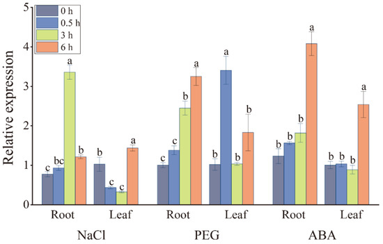 Expression of the ScDREB2B-1 gene in sugarcane hybrid ROC22 under sodium chloride (NaCl), polyethylene glycol (PEG) 8000 and abscisic acid (ABA) treatments by RT-qPCR analysis. Quantitative data were normalized by the expression level of double references of CAC (clathrin adaptor complex) and CUL (cullin) genes. All expression data points were means ± standard error (n = 3). Significant differences were found between different letter substitutes on the column calculated by Duncan’s new multiple range test (p-value < 0.05).