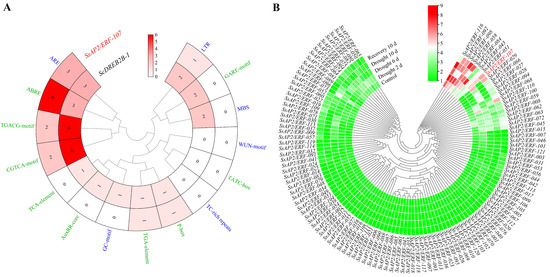 Promoter elements analysis of the ScDREB2B-1 gene and expression profiles of the Saccharum spontaneum SsAP2/ERF gene family under drought stress. (A) Promoter elements analysis between ScDREB2B-1 and its homologous gene SsAP2/ERF-107 in S. spontaneum. Green and blue fonts represented hormone responsive elements and environmental stress-related elements, respectively. (B) Expression profiles of S. spontaneum SsAP2/ERF gene family under drought stress. The red font was SsAP2/ERF-107, which was a member of the ERF subfamily and a homologous gene of ScDREB2B-1. The expression heat map of SsAP2/ERF was constructed by TBtools with the transcript level transformed by log2 (FPKM + 1). FPKM mean fragments per kb per million.