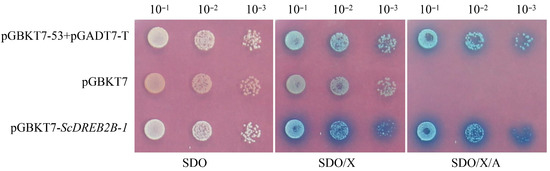 Y2H Gold cells that transformed with the recombinant vectors of pGBKT7-53+pGADT7-T (positive control), pGBKT7 (negative control) and pGBKT7-ScDREB2B-1 were all white on SDO media, indicating that these transformations were successful. The Y2H Gold transformants with pGBKT7-ScDREB2B-1 were blue on SDO/X and SDO/X/A media, indicating that the ScDREB2B-1 protein had self-activation activity (Figure 5).