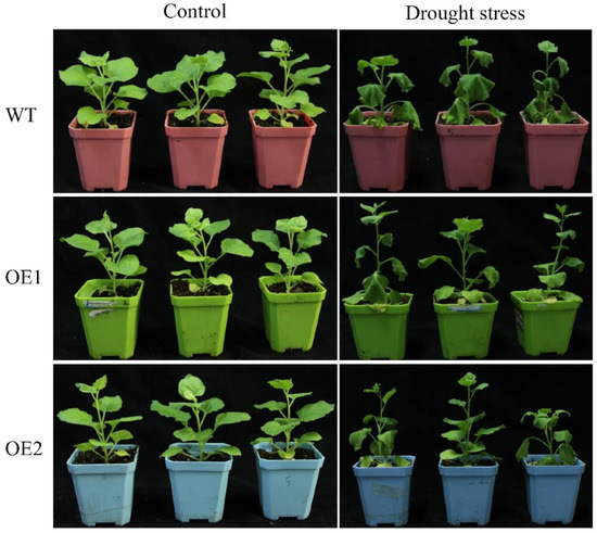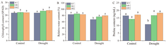 After stable genetic transformation, two homozygous transgenic lines, OE1 and OE2, were randomly selected from the T3 generation of N. benthamiana seeds overexpressing the ScDREB2B-1 gene. Under drought stress for 2 d, the wild-type (WT) plants were wilted, and the degree of withering was much more severe than in the transgenic lines (Figure 6). There was no significant difference in chlorophyll content between the WT and transgenic lines under drought treatment (Figure 7A). However, the relative water content (RWC) of transgenic lines OE1 and OE2 was 1.13 and 1.18 times higher, respectively, than those of the WT plants (Figure 7B). Under normal conditions, there was no significant difference in proline content between the WT and transgenic lines. After 2 days of drought treatment, the proline content of OE1 and OE2 was significantly increased, which was 1.54 and 1.70 times that of the WT plants, respectively (Figure 7C). These results indicate that the overexpression of ScDREB2B-1 enhanced the drought tolerance of N. benthamiana plants to a certain extent by increasing the proline content and water-retention ability.