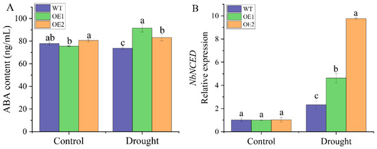 Under normal conditions, there was no significant difference in the ABA content between the transgenic lines and the WT plants (Figure 8A). Interestingly, the ABA contents of OE1 and OE2 was higher than that of the WT plants after 2 days of drought treatment, which were 1.24 and 1.13 times that of the WT plants, respectively. The RT-qPCR results showed that there was no significant difference in the expression level of the ABA response gene NbNCED between the WT plants and transgenic lines under normal conditions (Figure 8B). However, after 2 days of drought treatment, the expression level of NbNCED in the two transgenic lines was significantly higher (1.99 and 4.20 times) than that of the WT plants (Figure 8B). The above results showed that ABA accumulated, and the expression of its response gene (NbNCED) increased in transgenic plants under drought stress, indicating that ScDREB2B-1 could aid in improving the tolerance of N. benthamiana plants to drought stress by regulating the ABA signal.