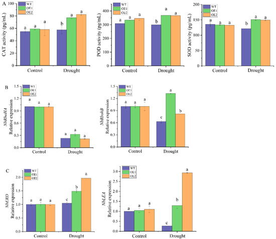 Under normal conditions, there was no difference in catalase (CAT), peroxidase (POD) and superoxide dismutase (SOD) activities between transgenic lines and the WT plants (Figure 9A). After 2 days of drought treatment, the CAT, POD and SOD activities of all transgenic plants were significantly increased, which were 1.34 and 1.43 times, 1.23 and 1.22 times and 1.24 and 1.23 times of the WT plants, respectively. The expression levels of four stress-responsive genes in the WT plants and transgenic lines under drought stress were analyzed by RT-qPCR (Figure 9B,C). The results showed that there was no significant difference in the expression levels of these four genes between the WT plants and transgenic lines under normal conditions. Two days after drought stress, the expression level of the reactive oxygen species (ROS)-producing enzyme-related gene NbRbohA in the transgenic lines was not significantly different from that in the WT plants (Figure 9B). In contrast, expression of the NbRbohB gene in the OE1 and OE2 transgenic lines was 2.10 and 1.30 times higher than that in the WT plants, respectively (Figure 9B). Compared with the WT plants, the osmotic stress-related genes NbERD and NbLEA were significantly upregulated in the two transgenic lines, which were 1.05 and 1.88 times and 4.78 and 10.86 times that of the WT plants, respectively (Figure 9C). In general, under drought stress, the overexpression of ScDREB2B-1 significantly upregulated the expression of ROS production enzyme-related genes (NbRbohB) and osmotic stress-related genes (NbERD and NbLEA), as well as significantly increased ROS-scavenging enzyme activity (CAT, POD and SOD).