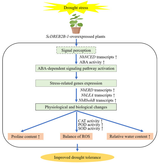 Based on these results, the sugarcane ScDREB2B-1 gene could enhance the drought resistance of N. benthamiana plants by regulating the expression of stress response genes, together with physiological and biochemical reactions. Collectively, compared with WT plants, the overexpression of the ScDREB2B-1 gene improved the drought tolerance of transgenic N. benthamiana by activating the ABA signaling pathway to enhance the expression of the ABA response gene (NbNCED) and the ABA content, upregulating the expression level of the stress-related genes (NbRbohB, NbERD and NbLEA) and then changing the physiological and biochemical levels of the plants, such as modulating the intracellular ROS level through the enhanced activities of CAT, POD and SOD and increasing the relative water and proline content (Figure 10).