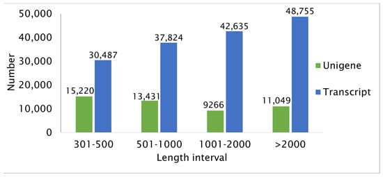 More than 159,701 transcripts were assembled and a total of 48,966 non-redundant unigenes were generated. A total of 15,220 unigenes (31.08%) had a sequence length of up to 500 bp and 13,431 unigenes (27.43%) had a length of 501–1000 bp. In addition, 9266 unigenes (18.92%) had a length of 1001–2000 bp, and 11,049 unigenes (22.56%) had a sequence longer than 2000 bp. As a result, the number of transcripts assembled in this project increased as the sequence length increased; however, the percent of the assembled number of unigenes decreased despite the increasing number of transcripts for a given length in bp (Figure 1).