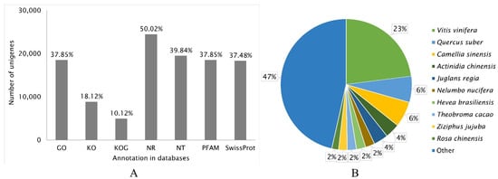 All assembled unigenes (48,966) obtained by sequencing of the R. nigrum transcriptome were annotated into seven databases: GO, KO, KOG, NR, NT, PFAM, and SwissProt (Figure 2A). The largest number of unigenes 24,497 (50.02%) in the de novo assembled genome were identified and functionally annotated by the NR database. The annotation data according to the databases GO, NT, PFAM, and SwissProt were similar, and 37.85%, 39.84%, 37.85%, and 37.48% of the unigenes were identified, respectively. Finally, the least number of functionally annotated genes were identified according to the data of KO and KOG, with 18.12% and 10.12%, respectively.