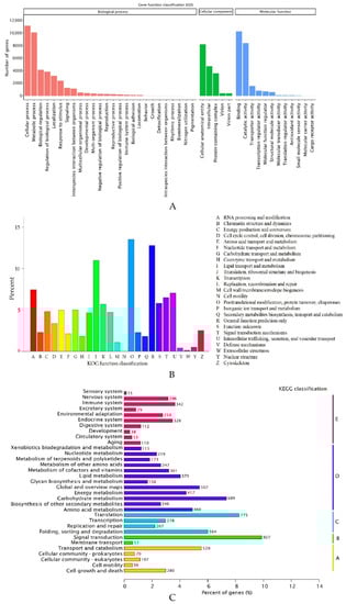 Characteristics of blackcurrant unigenes based on Gene Ontology (GO) categorization (A), Clusters of Orthologous Group (KOG) classification (B), and Kyoto Encyclopedia of Genes and Genomes (KEGG) pathways classification (C). The x-axis is the names of the 25 KOG group, and the y-axis is the percentage of genes annotated under this group of the total annotated genes. The y-axis is the names of the KEGG pathways, and the x-axis is the number of genes annotated in the pathway and the ratio between the number in this pathway and the total number of annotated genes. The KEGG metabolic pathway genes are divided into 5 branches: A: Cellular Processes, B: Environmental Information Processing, C: Genetic Information Processing, D: Metabolism, E: Organismal Systems.