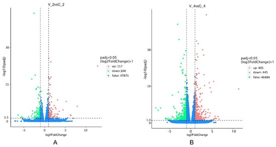 The number of differentially expressed genes (DEGs) in response to BRV infection at 2 (A) and 4 dpi (B) in R. nigrum cv. Aldoniai. The threshold is normally set as: [log2 (Fold Change)] > 1 and q-value < 0.005. The x-axis shows the fold change in the gene expression between different samples, and the y-axis shows the statistical significance of the differences. Statistically significant differences are represented by red or green dots.