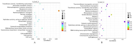 The enriched gene pathways identified by GO (functional categories grouping) are presented in Figure 5. Twenty functional pathways with reliable expression of specific genes were identified in each post-inoculation period. However, the structure of enriched gene pathways was partially different between the studied periods. Specifically, for the activated pathways, the DEG characteristics are presented in the Supplementary Materials (Table S2). Statistically significantly upregulated DEGs (gene ratio 19:65) at 2 dpi were identified in the molecular function oxidoreductase activity (Figure 5A). Meanwhile, at 4 dpi, the oxidoreductase activity function genes were downregulated at a ratio of 54:256, and the biological process response to stress was upregulated at a gene ratio of 26:204 (Figure 5B).