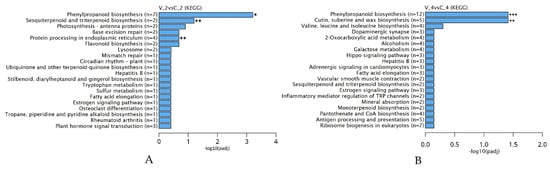 Enriched gene pathways identified according to GO involving differentially expressed genes (DEGs) following biotic stress (virus) inoculation at 2 (A) and 4 dpi (B) in R. nigrum cv. Aldoniai.