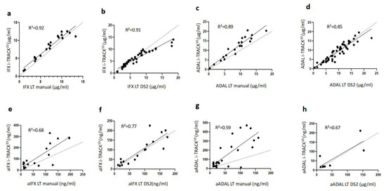 (a–h) Comparison between IFX, ADAL, aIFX, and aADAL data obtained using i-TRACK10® and Lisa-Tracker® (LT) assay performed manually or with the DS2 instrument. R² values are shown for all linear correlations (a–h).