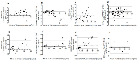 Bland–Altman plots to compare different assays: (a,b) Comparison of IFX level between i-TRACK10® and Lisa tracker® (LT) assays; (c,d) comparison of ADAL level between i-TRACK10® and Lisa-Tracker® assays; (e,f) comparison of aIFX level between i-TRACK10® and LT® assays; (g,h) comparison of aADAL level between i-TRACK10® and LT® assays. The difference between the two measurements (µg/mL for drugs and ng/mL for ADAs) is plotted on the y-axis, and the average of the two measurements on the x-axis. Dashed lines represent the bias and the 95% limits of agreement for each comparison.