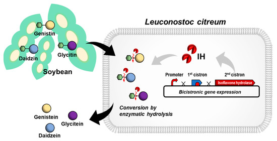 In this study, we report the engineering of L. citreum for efficient bioconversion of soybean isoflavone glycosides (Figure 1). β-glucosidase is known as the enzyme that is responsible for the hydrolytic breakdown of carbohydrates such as cellobiose [27], and it can be classified as isoflavone hydrolase with high specificity towards isoflavone glycosidic conjugates. Therefore, an expression module based on the isoflavone hydrolase encoding gene of Bifidobacterium lactis, which mediates the conversion of isoflavone glycosides to aglycone forms, was constructed in L. citreum. Using a high copy number plasmid (pCB4270) and bicistronic expression design, the isoflavone hydrolase from B. lactis (IH) was successfully synthesized in L. citreum, and enzymatic activity of the IH was determined using an in vivo β-glucosidase assay. Naturally, there are several types of soy isoflavone glycosides including malonyl, acetyl, and underivatized glucosides, and their content differs depending on product type and processing conditions [2,28]. Among them, the major isoflavones in soybeans are underivatized glucosides such as daidzin, genistin, and glycitin [28,29,30], so we focused on the bioconversion of underivatized glucosides (genistin, daidzin, and glycitin) and confirmed its highly efficient bioconversion efficiency for all those glucosides to their aglycone forms. Finally, using engineered L. citreum, we demonstrated that isoflavone glycosides produced during fermentation of soymilk could be converted into aglycones with a high conversion yield.