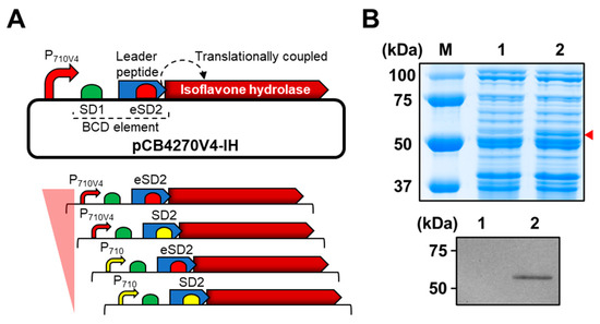 Expression of the gene encoding for IH in L. citreum for bioconversion of soy isoflavone glycosides. (A) Schematic diagram of bicistronic design (BCD) for expression of the gene encoding for IH. Up, plasmid pCB4270V4-IH constructed for the expression of the gene encoding for IH in L. citreum; down, four different expression systems with different strengths of promoters (P710 and P710V4) and SD (SD2 and eSD2) parts. (B) SDS-PAGE and western blot analysis of IH gene expression in L. citreum harboring pCB4270V4-IH (P710V4 and eSD2). Up, SDS-PAGE analysis. Lane M, molecular weight markers (kDa); Lane 1, soluble fractions of L. citreum wild type; Lane 2, soluble fractions of L. citreum harboring pCB4270V4-IH. Arrowhead indicates the band of IH; down, confirmation of IH by western blot assay. Lane 1, L. citreum wild type; Lane 2, L. citreum harboring pCB4270V4-IH.