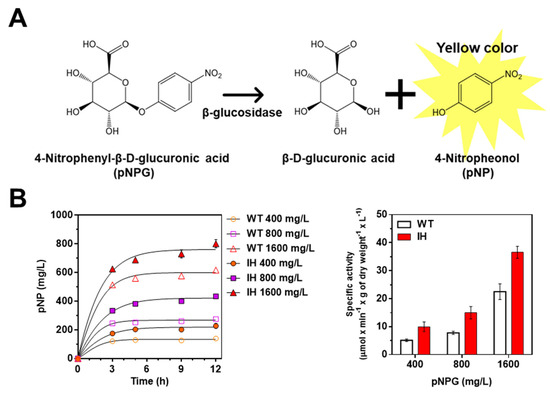 After we confirmed that the IH gene was properly expressed in L. citreum harboring pCB4270V4-IH, an in vivo β-glucosidase activity assay was performed to assess whether the synthesized IH was capable of being enzymatically active in L. citreum. The β-glucosidase activity was determined by bioconversion of 4-nitrophenyl-β-d-glucopyranoside (pNPG) into 4-nitrophenol (pNP) during bacterial cultivation (Figure 3A). The enzymatic product pNP was measured directly from the supernatant of the culture medium at an absorbance of 405 nm. Since MRS medium also displays absorbance at the same wavelength (405 nm), 0.1 M sodium carbonate was added to the supernatant to increase the molar extinction coefficient of pNP [32].