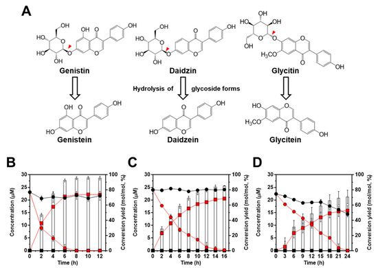 Edible plants are dietary sources of numerous phytochemicals, which are typically secondary metabolites that occur in plant-derived foods. Among the various classes of phytochemicals, polyphenols, which include phenolic acids, flavonoids, and stilbenes are the major classes of bioactive phytochemicals [1]. One of the important physiological properties of these molecules is their superior ability to promote human health and reduce oxidative stress in mammals [1]. Soy isoflavones present in various plants, particularly in soybeans, are classified as flavonoids with a structure similar to estrogen and possess both estrogen-agonist and estrogen-antagonist properties [1,2]. In recent years, the potential health benefits of soy isoflavones have been revealed to include numerous physiological properties such as anti-aging and anti-tumor properties [2,3]. Furthermore, soy isoflavones have the ability to improve learning and memory and also aid in preventing heart diseases, diabetes, and Kawasaki disease [2]. Isoflavones also possess protective antioxidant properties that help prevent oxidative stress by reducing the generation of free radicals and reactive oxygen species (ROS) via decomposition of hydrogen peroxide and quenching of singlet oxygen [1,4]. In their natural environment, soy isoflavones exist in glycoside forms (genistin, daidzin, and glycitin) which bind to sugar molecules. However, to be absorbed in mammals, the bound sugar molecules need to be released, thus leading to the formation of aglycones such as genistein, daidzein, and glycitein [5]. In soybeans, since most isoflavones exist in glycoside forms, their bioavailability requires initial hydrolysis of the sugar moieties by isoflavone hydrolases produced by commensal bacteria present in the gut, because mammals do not possess intrinsic isoflavone hydrolases [6,7]. In this regard, to enhance the bioactivity and bioavailability of soy isoflavones, various strategies based on chemical methods, including hydrolysis of isoflavone glycosides into aglycone forms using acid or organic solvents, have been developed for the extraction of isoflavones [8,9,10]. However, these methods are energy-intensive, and byproducts produced during the extraction can result in environmental pollution and safety issues for downstream applications. Consequently, alternative strategies that use biological methods relying on microorganisms or immobilized enzyme systems to enhance the bioavailability of soy isoflavones are gaining attention [11,12].