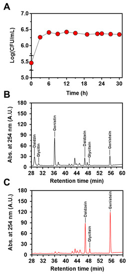Soymilk (4%, w/v) was prepared by dissolving soybean flour (Sigma-Aldrich) in deionized water and autoclaving at 121 °C for 15 min. L. citreum cells harboring pCB4270V4-IH were inoculated into MRS (BD) medium. After the cells were cultivated for 16 h at 30 °C with shaking at 200 rpm at 30 °C, they were transferred to 250 mL baffled flasks containing 50 mL of MRS medium at 1:100 dilution and grown at 30 °C with shaking (200 rpm) for 24 h. Later, the cells were transferred to 50 mL of 4% soymilk at 5% (v/v) dilution and incubated at 30 °C with shaking (200 rpm) for 30 h. To analyze growth profiles of L. citreum harboring pCB4270V4-IH, 10 µL of the soymilk sample was diluted with PBS buffer and spread onto MRS agar plates with 10 µg/mL chloramphenicol at 30 °C for 24 h. The number of bacteria (CFU/mL) was calculated using the recovered colonies. Extraction of isoflavones from the fermented soymilk was performed in triplicate. Briefly, 1 mL aliquots of the sample were freeze-dried using a lyophilizer (ilShinBioBase, Daejeon, Korea). The lyophilized samples were dissolved in 80% methanol and heated to 60 °C for 2 h to extract the isoflavones. Next, the samples were centrifuged at 13,000 rpm for 5 min, and the supernatants thus obtained were loaded onto HPLC vial to measure the amount of isoflavone using HPLC.