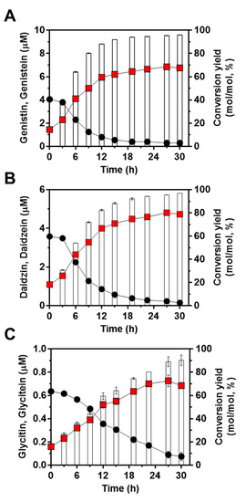 Next, to confirm the feasibility of the engineered strain of L. citreum to convert soy isoflavones during soymilk fermentation, cells were cultivated in 4% soymilk-containing media, and the concentrations of the three isoflavones (genistin, daidzin, and glycitin) and their aglycons (genistein, daidzein, and glycitein) were determined during 30 h of fermentation. As shown in Figure 5A, L. citreum harboring pCB4270V4-IH showed a constant growth rate until 6 h of fermentation and reached a stationary phase during the fermentation process. All the soy isoflavones, including genistin, daidzin, and glycitin, were successfully converted to aglycone forms by L. citreum harboring pCB4270V4-IH during soymilk fermentation (Figure 5B,C). L. citreum harboring pCB4270V4-IH gradually converted 4 µM genistin present in soymilk to 6.8 µM of genistein, with a conversion rate of 0.23 µM/h and a yield of 95% (0.95 mol/mol) (Figure 6A). Next, about 3.5 µM of daidzin present in soymilk was converted to 4.7 µM of daidzein, with a conversion rate of 0.16 µM/h and a yield of 96% (0.96 mol/mol) (Figure 6B). Finally, about 0.63 µM glycitin was converted to 0.68 µM of glycitein, with a conversion rate of 0.02 µM/h and a yield of 90% (0.90 mol/mol) (Figure 6C). All conversion data are summarized in Table 2. These results clearly confirmed that the engineered L. citreum had a highly efficient bioconversion property to convert all the isoflavone glycosides’ forms into aglycone forms, even during fermentation of soymilk.