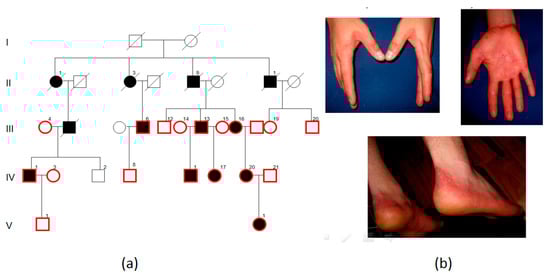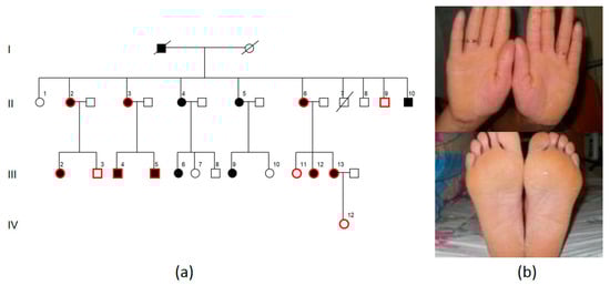 PPK1 pedigree: black—affected family members, white—healthy family members, I–V—generations, 1–21—number of the person in the generation, red contour—symbols corresponding to the examined and genotyped family members (a); symptoms of palmoplantar keratoderma in patients: soft yellow diffuse keratoderma on palms and soles, keratolysis and erythematous plaques with a clear demarcation line on the borders of the affected zones of palms and soles (b).
