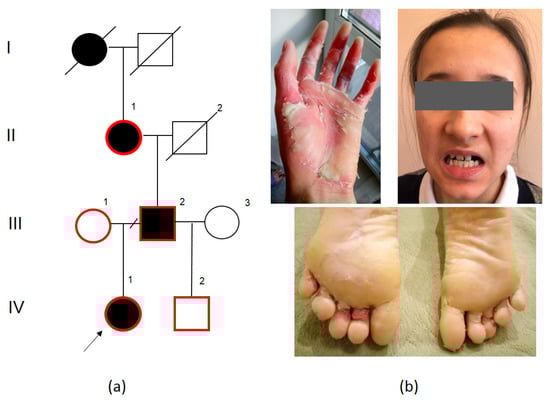 PPK2 pedigree: black—affected family members, white—healthy family members, I–IV—generations, 1–3—number of the person in the generation, red contour—examined and genotyped family members (a); symptoms of PPK in patients: diffuse palmoplantar keratoderma, keratolysis, perioral keratosis, fissures in the corners of the mouth, hypodontia (b).