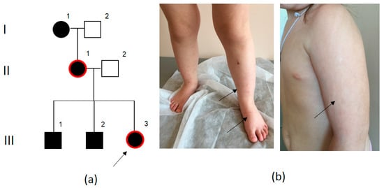 PPK4 pedigree: black—affected family members, white—healthy family members, I–III—generations, 1–3—number of the person in the generation, red contour—examined family members (a). Proband: arrows point at striped skin hyperpigmentation and depigmentation (b).