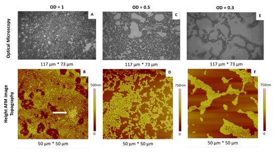 Even if the preparation of bacterial suspensions in water is the last step before imaging, we begin the description of our work by this final step, since the dilution of these suspensions (and, thus, the retained O.D. value) is an essential parameter determining the quality of samples. Indeed, the AFM study cannot be managed using samples made of bacteria multilayers or at a too-low bacteria density, obtained from overly or insufficiently concentrated solutions, respectively. The corresponding solutions were deposited by “simple deposition” on glass slides and bare mica substrates, dried and characterized by OM and AFM. Representative results are shown in Figure 1. As expected, the cell density decreased with decreasing O.D. values. At the highest O.D. value (Figure 1A,B), dense colonies were observed, covering a large part of the surface of the substrate with the presence, locally, of multilayers (white arrow, Figure 1B).