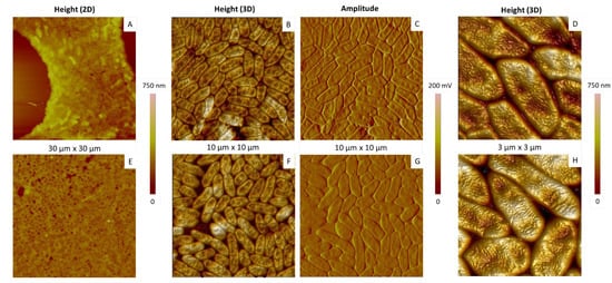 As illustrated in Figure 5, different organizations of these structures were observed according to the probed cell. Ripples can be more or less long and organized, randomly oriented or aligned (for some of them). In some cases, their length can largely exceed a hundred nanometers (Figure 5E,F) and even approach a micrometer, in particular in the case of aggregated cells (results not shown). These observations underline the inherent heterogeneity of biological samples.