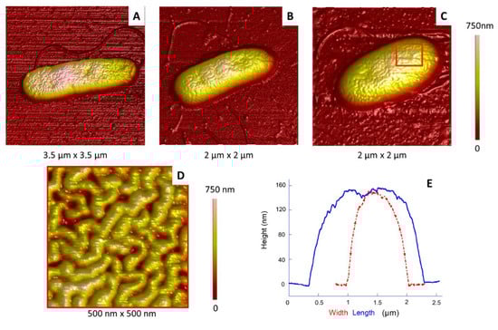 Morphological analysis of P. fluorescens cells. (A–C) AFM 3D topography images of isolated cells; (D) AFM phase image corresponding to the red square in (C); (E) height profiles in length (blue) and width (red) of the cell shown in (C).