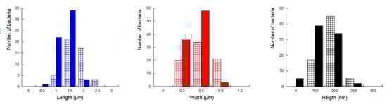 Histograms of P. fluorescens length (blue), width (red) and height (black). Measurements were performed on 120 aggregated cells (solid bars) and 40 isolated cells (hatched bars).