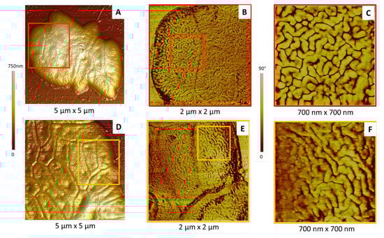 Membrane characteristics of P. fluorescens cells. (A,D) The 3D topographic AFM images of aggregated cells; (B,E) phase AFM images of areas in the red and orange squares in images (A) and (D), respectively; (C,F) phase AFM images of areas in the red and orange squares in images (B) and (E), respectively.