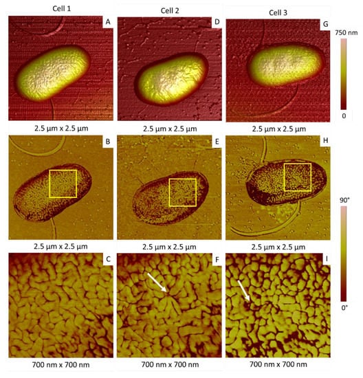Relationship between membrane organization and invaginations. (A,D,G) AFM 3D topographic images of three bacteria; (B,E,F) corresponding phase images; AFM images shown in (C,F,I) correspond to the areas in the squares indicated in (B,E,H), respectively. White arrows indicate the bottom of the invagination.