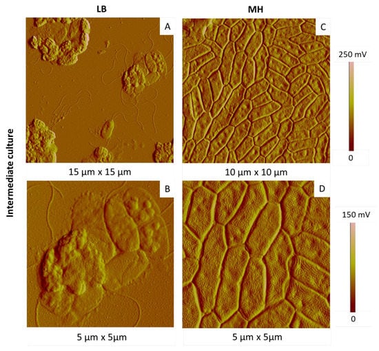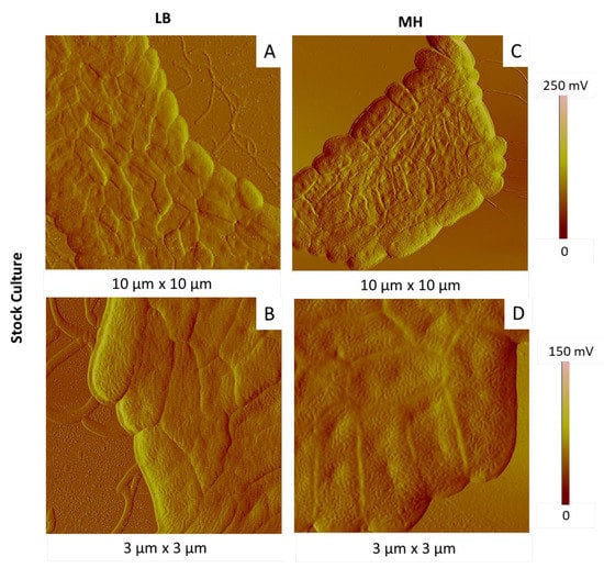Keeping culture temperature and time at 28 °C and 15 h, respectively, we then tested two different culture media, LB and MH. We followed two successive generations (with the first generation from stock culture). The most representative AFM images are shown in Figure 8 and Figure 9 for the first and second generations, respectively.