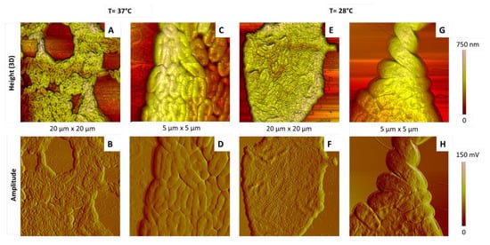 Figure 10 shows the most representative AFM images of simple deposits after incubation of bacteria at 37 °C and 28 °C. Their comparison shows the following points.