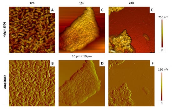 Figure 11 and Figure 12 show typical AFM images of bacteria incubated during 12, 15 and 24 h at 28 °C.