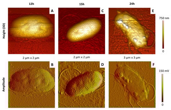 At the intermediate time (15 h), AFM images of aggregated (Figure 11C,D) and isolated (Figure 12C,D) cells were typical from healthy bacteria, with the usual dimensions and shape, and the heterogeneous membrane structure mentioned previously.