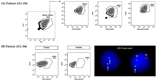 To detect Jak2-Stat5 pathway activation, fresh cells from bone marrow were stimulated with 200 ng/mL of thymic stromal lymphopoietin (TSLP) (PeproTech, Cranbury, NJ, USA) for 30 min at 37 °C, and stained with the following cell surface monoclonal antibodies: CD45 Amcyan, CD34 PECy7, CD19 PerCP, and CD10 PE (Becton Dickinson, Franklin Lakes, NJ, USA). Then, the cells were fixed and incubated with monoclonal antibodies, as previously reported, to identify the phosphorylated target Stat5 (pY694) Pacific Blue. For Abl and Ras pathways, similar conditions were used, except for the TSLP stimulation; the surrogate marker CrkL (pY207) AF488 was used for Abl, and Erk 1/2 (pT202/pY204) AF488 for Ras; a positive result was considered when populations >5% of blasts were detected. In samples with adequate numbers of cells, abnormal pathway activity was selectively inhibited in vitro for 30 min with ruxolitinib (5 nM) (Selleckchem, Houston, TX, USA) to inhibit the Jak2-Stat5 pathway, and with imatinib (5 μM) (Selleckchem) to prevent Abl abnormal activation. The antibody concentration and conditions for each assay were performed based on the manufacturer’s recommendations. Flow cytometry was performed using a BD FACSVerse Cell Analyzer System and data were analyzed by FlowJo vX software.