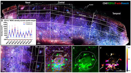 In terms of regional differences across the eyelid margin (nasal, central, and temporal), irrespective of age or eyelid location (superior vs. inferior), the CD11c+ MOIC density from nasal to temporal regions was similar (nasal: 819478 cells/mm2 vs. central: 751560 cells/mm2 vs. temporal: 628432 cells/mm2, p > 0.05, Figure 2S).