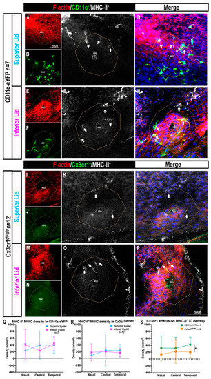 Confocal microscopy images of MHC-II+ MOICs. F-actin (red) highlighting the MGO in CD11c-eYFP mice; superior lid (A–D) and inferior lid (E–H), and Cx3cr1gfp/gfp mice; superior lid (I–L) and inferior lid (M–P). White arrows are MOICs that are MHC-II+. Graph represents MHC-II+ MOIC distribution in CD11c-eYFP (Q) and Cx3cr1gfp/gfp (R) mice and the effects of Cx3cr1 deficiency on MHC-II+ MOIC density along the eyelid margin (S). All data are presented as mean SD, (* p 0.05). Scale bar in (A) applies to panels (B,E,F,I,J,M,N), and in (P) applies to panels (C,D,G,H,K,L,O,P).