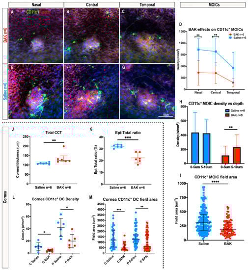 BAK- vs. saline-treated eyes. Confocal microscopy images of CD11c+ MOICs around MGOs in BAK-treated CD11c-eYFP mouse eyes (A–C) and saline-treated controls (E–G). (D) Graph represents the effect of BAK on CD11c+ MOICs in each region, and the distribution of CD11c+ MOICs from 0–5 µm and 5–10 µm depths in saline controls vs. BAK-treated eyes (H), mean SD. (I) CD11c+ MOIC field area in saline controls vs. BAK-treated eyes, median (inter-quartile-range). (J) Total central corneal thickness (CCT) between saline controls and BAK-treated eyes, median (inter-quartile-range). (K) Corneal epithelial thickness: total central corneal thickness ratio (%) between saline controls and BAK-treated eyes. (L) Corneal CD11c+ DC density in the central and peripheral corneal regions in saline controls vs. BAK-treated eyes. (M) Corneal CD11c+ DC morphology, measured by field area, in the central and peripheral corneal regions comparing saline controls vs. BAK-treated eyes, median [inter-quartile-range]. For (L) and (M): C, central; P, peripheral. For statistical analyses: * p 0.05; ** p 0.01; *** p 0.001; **** p 0.0001. Scale bar in (G) applies to all confocal images.