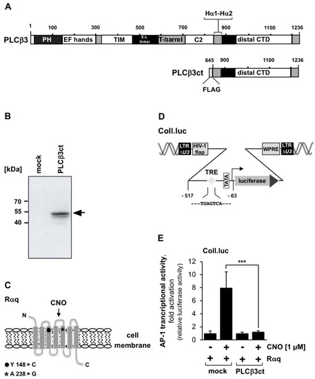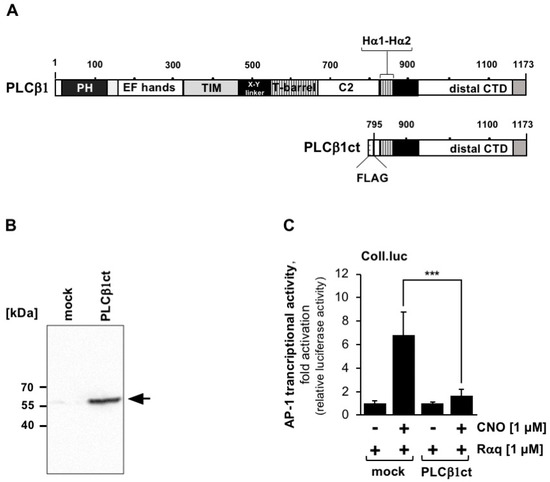 The PLCβ isoenzymes PLCβ1 and PLCβ4 have been found to be associated with the plasma membrane, whereas the isoenzymes PLCβ2 and PLCβ3 have been found in the cytoplasm [33]. This difference in cellular expression pattern is attributed to sequence differences within the C-terminal domain, which has only 30–35% identical amino acids between the different isoforms [34,35]. Subcellular analysis of GFP-tagged C-terminal domains of PLCβ1 and PLCβ3 revealed that the fusion protein of GFP together with the C-terminal domain of PLCβ1 was clearly visible at the plasma membrane. The fusion protein of GFP together with C-terminal domain of PLCβ3 was also located at the plasma membrane as well as in the cytosol [33]. We, therefore, tested whether the C-terminal domain of the membrane-associated PLCβ1 had similar or even greater activity in inhibiting Gαq-coupled receptor signaling. Figure 4A shows the domain structure of PLCβ1 and the truncated mutant PLCβ1ct. The expression of the mutant in HEK293 cells is depicted in Figure 4B. Cells containing the Coll.luc reporter gene were infected with a lentivirus encoding Rαq. In addition, we infected the cells with a lentivirus encoding either PLCβ1ct or β-galactosidase (mock). The results show that expression of PLCβ1ct was very effective in blocking Gαq-coupled receptor signaling, as underscored by the fact that AP-1 transcriptional activity was reduced by 90.5% in the presence of PLCβ1ct. Thus, no major differences were obtained after expression of the C-terminal domains of PLCβ1 and PLCβ3.
