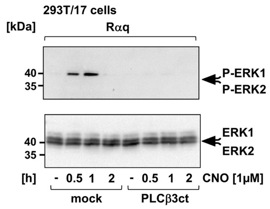 Stimulation of a Gαq-coupled receptor leads to the phosphorylation and activation of the protein kinase extracellular signal-regulated protein kinase (ERK1/2) [24,28]. Accordingly, the phosphorylation status of ERK1/2 was used to measure Gαq-coupled receptor signaling [29,30]. Figure 2 shows that stimulation of the designer receptor triggered the phosphorylation of ERK1/2 in HEK293 cells. Expression of the PLCβ3ct mutant of PLCβ3 efficiently blocked ERK1/2 phosphorylation and, thus, ERK1/2 activation.