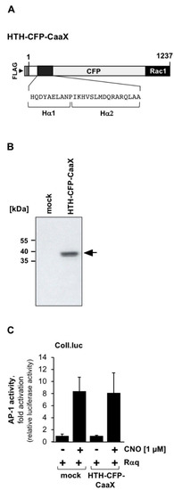 A fusion protein containing the helix-turn-helix (Hα1—Hα2) motif of PLCβ3 does not function as a dominant negative of Gαq-coupled receptor signaling. (A) Modular structure of HTH-CFP-CaaX. The FLAG-tagged fusion protein consists of the Hα1—Hα2 domain of PLCβ3, CFP, and the C-terminal domain of Rac1. (B) Expression of HTH-CFP-CaaX in HEK293 cells following infection with lentivirus encoding HTH-CFP-Caax. As a control, a virus encoding β-galactosidase (mock) was used for infection. The Western blot was developed with an antibody against the FLAG-tag. kDa, molecular mass markers. (C) HEK293 cells containing a chromatin-integrated Coll.luc reporter gene were infected with a lentivirus encoding the designer receptor Rαq. In addition, cells were infected with a lentivirus encoding either HTH-CFP-CaaX or β-galactosidase (mock). Cells were stimulated, harvested, and analyzed as described in the legend to Figure 1 (n = 4). Expression of HTH-CFP-CaaX did not significantly impair Gαq-coupled receptor signaling.