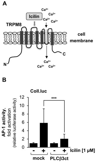 Expression of the C-terminal domain of phospholipase Cβ3 blocks icilin-induced signaling via TRPM8. (A) Modular structure of TRPM8. (B) HEK293-TRPM8 cells containing a chromatin-integrated Coll.luc reporter gene were infected with a lentivirus encoding either PLCβ3ct or β-galactosidase (mock). Serum-starved cells were stimulated with icilin (1 μM) for 24 h. Cells were harvested and analyzed as described in the legend to Figure 1 (n = 3; *** p < 0.001).
