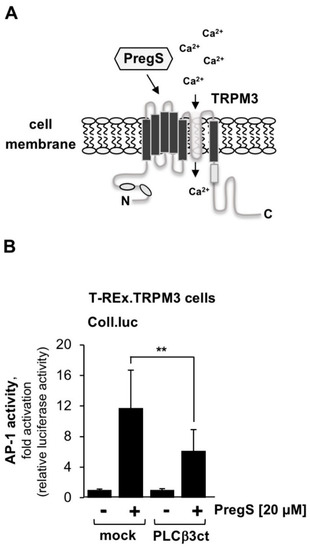 TRPM3 channels are involved in thermoregulation and several other activities, including regulation of insulin secretion. Figure 6A shows the modular structure of TRPM3 channels that can be stimulated with the steroid pregnenolone sulfate. We examined the effect of inhibition of PLCβ3 on TRPM3 signaling. Stimulation of TRPM3 channels triggers the activation of the transcription factor AP-1 [9,10]. Therefore, we determined the activity of AP-1 as a measure of TRPM3 signaling. Figure 6B shows that inhibition of PLCβ3 caused a 46% inhibition of TRPM3 signaling. From these data, we conclude that both TRPM3 and TRPM8 activities are regulated by PLCβ.