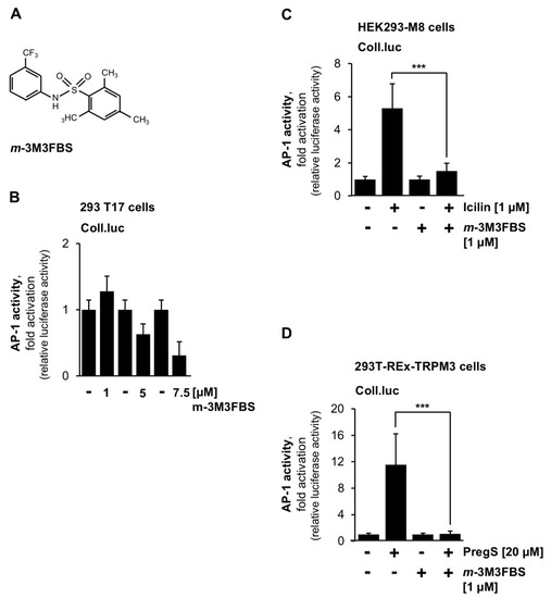 The compound m-3M3FBS blocks intracellular signaling mediated by TRPM8 and TRPM3. (A) Chemical structure of m-3M3FBS. (B) HEK293 cells containing the Coll.luc reporter gene were incubated with different concentrations of m-3M3FBS for 24 h. Cells were harvested and analyzed as described in the legend to Figure 1 (n = 3). (C) HEK293-M8 cells were infected with a recombinant lentivirus containing the Coll.luc reporter gene. Cells were serum-starved for 24 h, preincubated for 3 h with m-3M3FBS (5 μM), and then stimulated with icilin (1 μM). Cells were harvested and analyzed as described in the legend to Figure 1 (n = 3; *** p < 0.001). (D) T-REx-TRPM3 cells were infected with a recombinant lentivirus containing the collagenase promoter/luciferase reporter gene (Coll.luc). Cells were serum-starved for 24 h in the presence of tetracycline (1 μg/mL) to induce TRPM3 expression. Cells were preincubated for 3 h with m-3M3FBS (5 μM) and then stimulated with pregnenolone sulfate (PregS, 20 μM) for 24 h in the presence of the inhibitor. Cells were harvested and analyzed as described in the legend to Figure 1 (n = 3; *** p < 0.001).