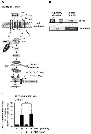The compound m-3M3FBS fails to block B-Raf signaling. (A) Signaling pathway connecting TRPM8 and TRPM3 stimulation with AP-1-induced gene transcription. The activation point of the fusion protein ∆B-Raf:ER is indicated. (B) Signaling pathway connecting TRPM8 and TRPM3 stimulation with AP-1-induced gene transcription. The activation point of the fusion protein ∆B-Raf:ER is indicated. (C) HEK293-∆B-Raf:ER cells were infected with a recombinant lentivirus containing Coll.luc reporter gene. The cells were incubated in medium containing 0.05% serum for 24 h. Stimulation was performed with 4OHT (100 nM) for 24 h. Cells were harvested and analyzed as described in the legend to Figure 1 (n = 3; n.s., not significant).